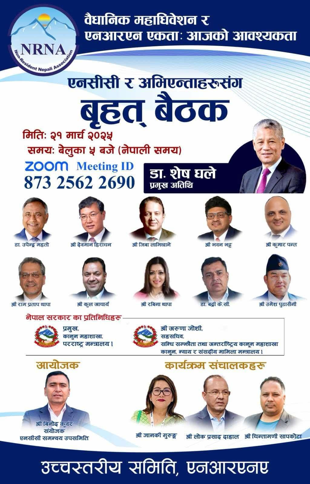 यस्तै गैरआवासीय नेपाली संघ एनसीसीका अध्यक्ष, पदाधिकारी तथा एनआरएनए अभियन्ताहरूको बैठकमा सहभागिता रहने भन्दै सक्रिय सहभागिताका लागि पत्रमार्फत अनुरोध गरिएको छ ।