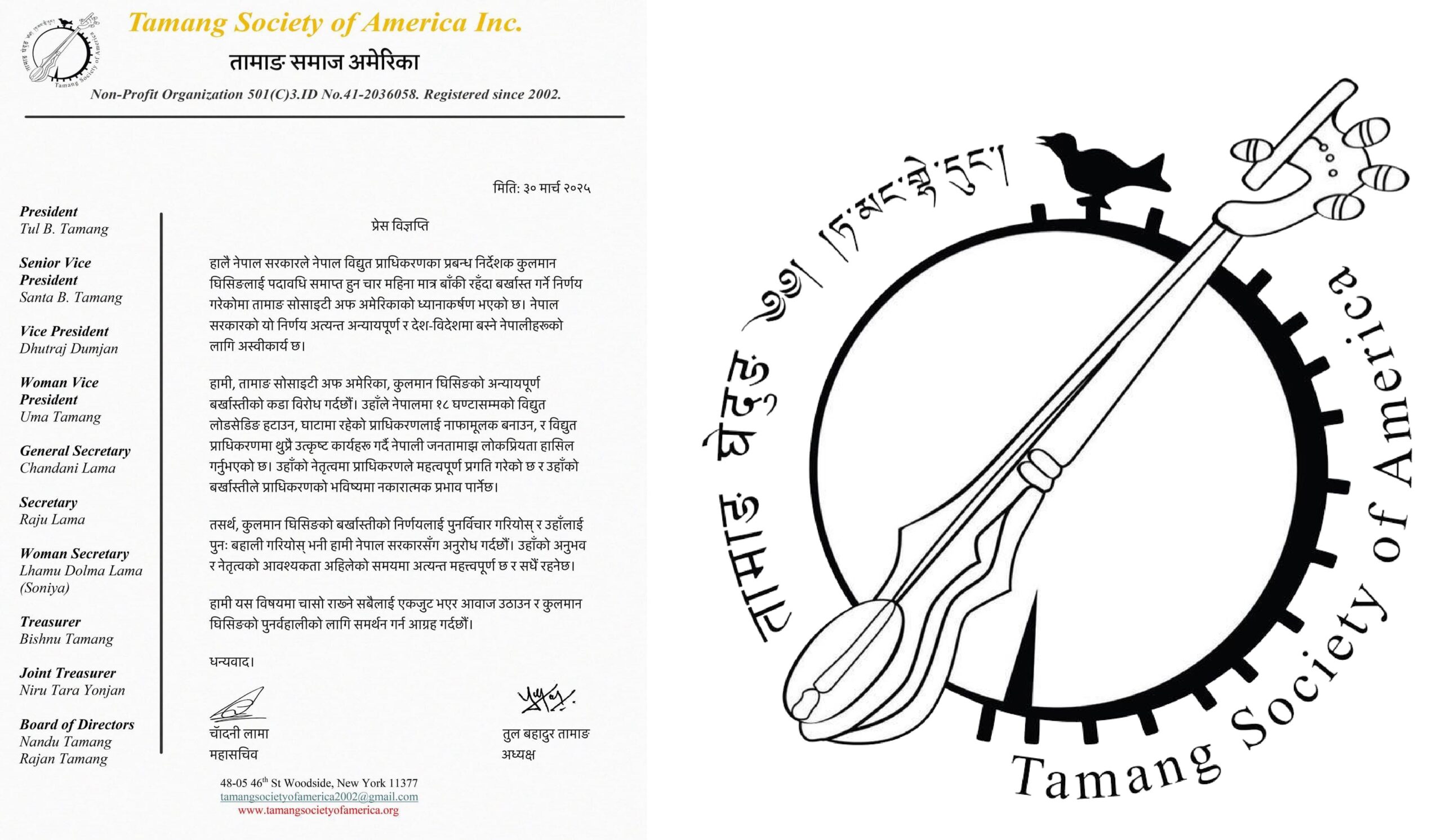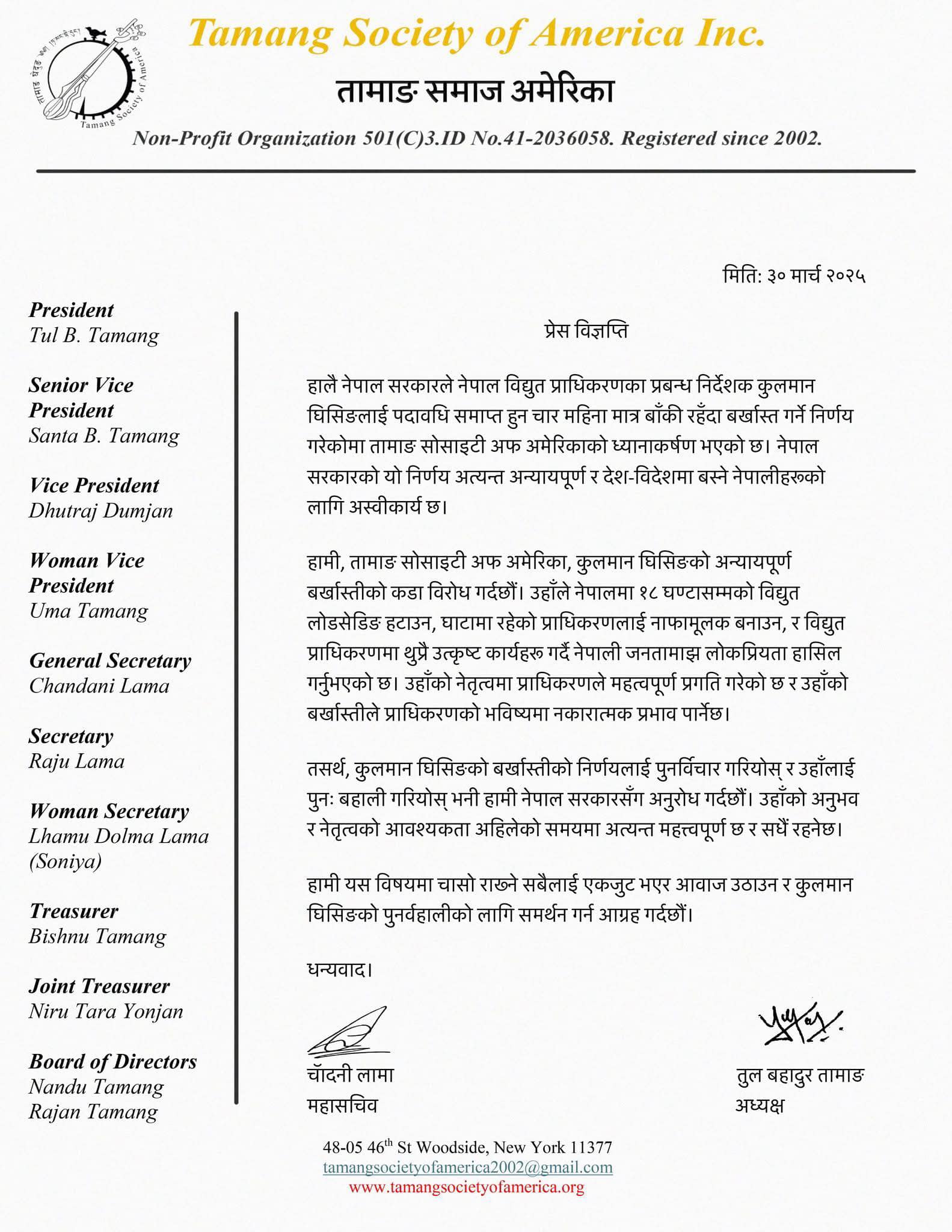 न्यूयोर्क, अमेरिका – नेपाल सरकारले नेपाल विद्युत प्राधिकरणका कार्यकारी निर्देशक कुलमान घिसिङलाई पदमुक्त गरेको विषयमा तामाङ सोसाइटी अफ अमेरिकाले गम्भीर आपत्ति जनाएको छ। सोसाइटीले एक प्रेस विज्ञप्ति जारी गर्दै घिसिङको निष्कासनप्रति घोर विरोध जनाउँदै उनलाई पुनः पदमा बहाली गर्न सरकारलाई आग्रह गरेको छ।