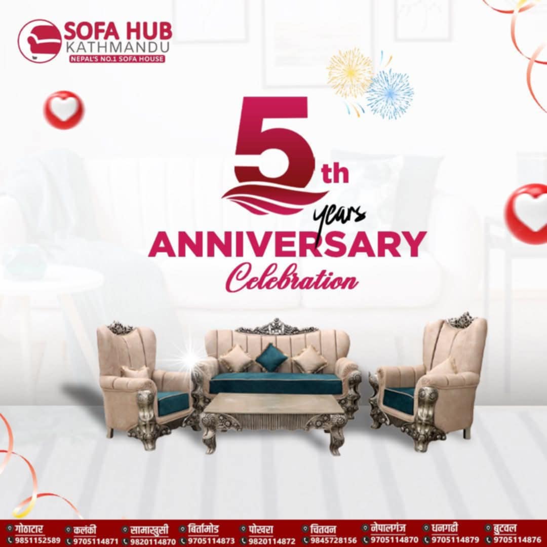 काठमाडौ । उत्कृष्ट गुणस्तरका सोफा तथा फर्निचर क्षेत्रमा आफ्नो छुट्टै पहिचान बनाउन सफल सोफा हब काठमाडौ चाैथो बर्ष पूरा गरी पाँचौ वर्षमा प्रवेश गरेको छ ।